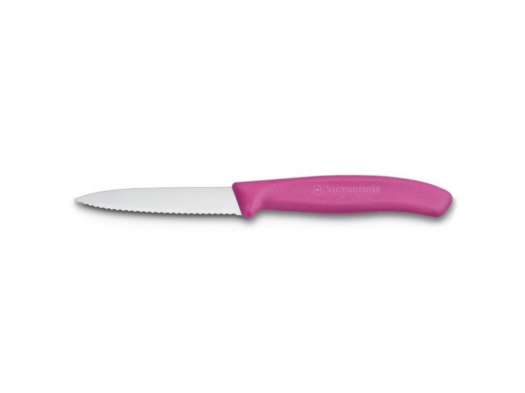 Kuchynský nôž VICTORINOX SwissClassic, ružovej farby, je univerzálny kuchynský nôž z polypropylénovou ergonomicky tvarovanou rukoväťou. Jeho 8 cm čepeľ so zúbkovaným ostrím, vyrobená zo švajčiarskej ocele, je ideálna na paradajky, ovocie, zeleninu, údeniny a drobné kuchynské úkony.